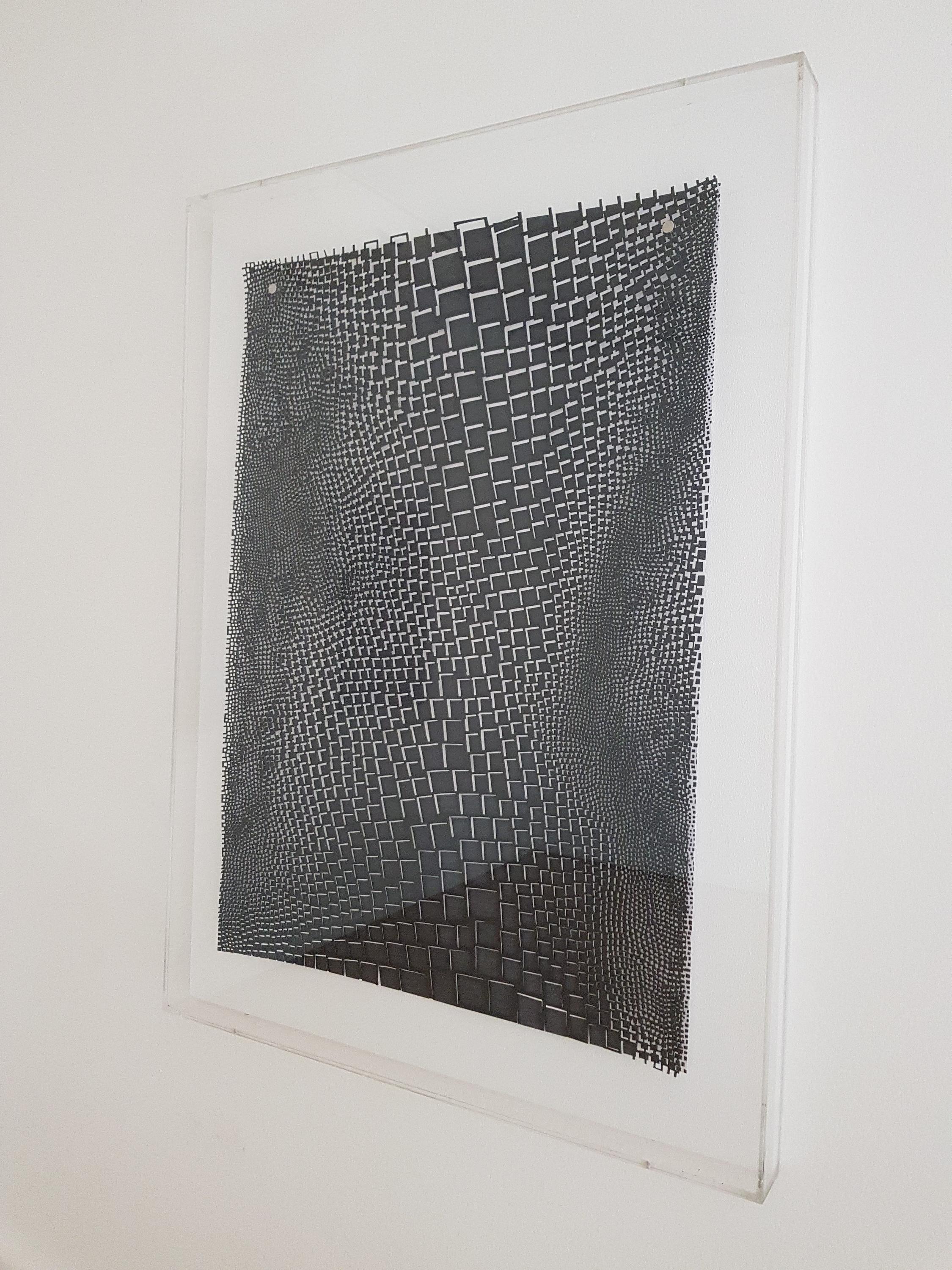 papercut over drawing on white lacquered wood in acrylic glass box